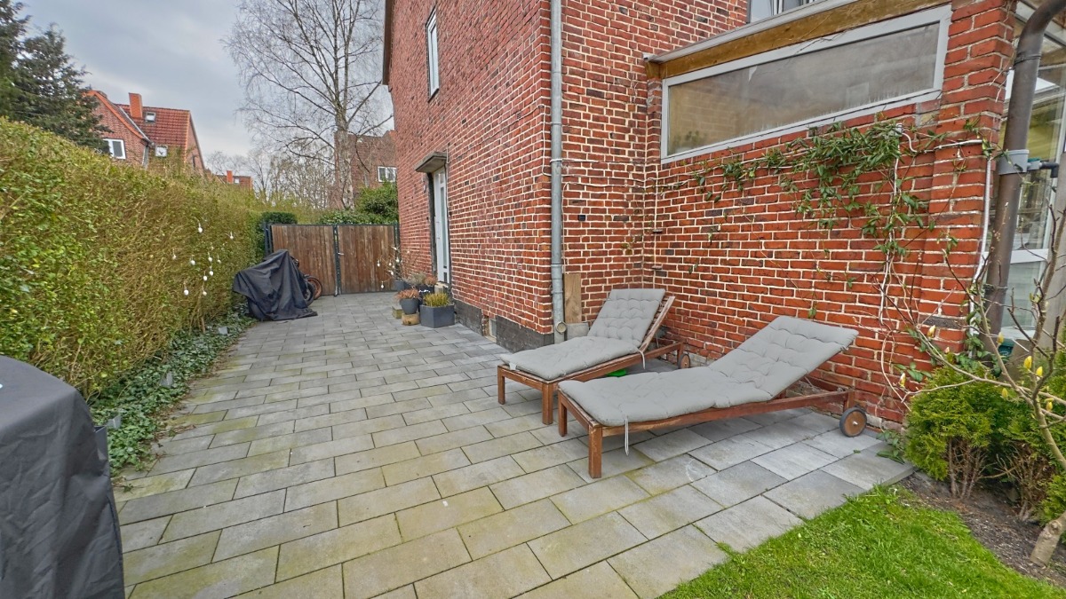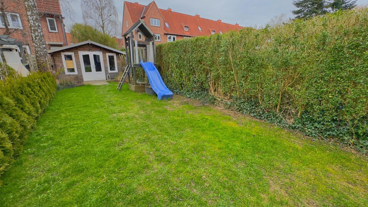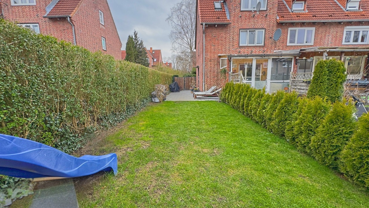 Finalisiert wird dieses tolle Angebot über Deinen eigenen Garten, mit Terrasse und geschützter (Grill-)Ecke. Neben der Rasenfläche ist auch ein geräumiges Gartenhaus für die Fahrräder vorhanden. Durch ein weiteres Tor kommst du hier auf kurzem Wege zur Straße.
