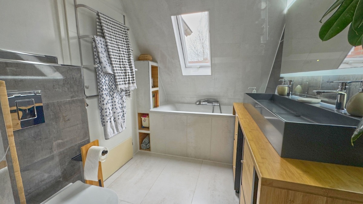 Als echtes Highlight ist das Badezimmer mit Badewanne und riesiger Dusche ausgestattet. Durch das zusätzliche Dachflächenfenster ist dieses wirklich hell und bietet beim Baden einen Blick in die Sterne, wer kann das sonst noch…