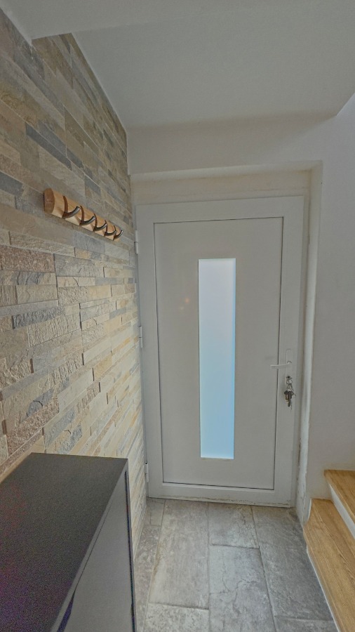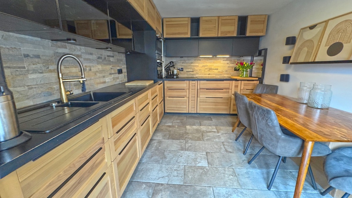 Über die, natürlich ebenfalls, erneuerte Eingangstür erreichst Du die Garderobe mit Zugang zum eigenen Keller und Aufstieg zur Küche. Die geschmackvollen Holzstufen bringen Dich genau dorthin, in eine moderne Ess- und Kochlandschaft mit großem Fenster und Allem, was Du zum Kochen mit der Familie und Freunden benötigst. Begriff Hygge-lich passt: Gemütlich und einfach nur schön!