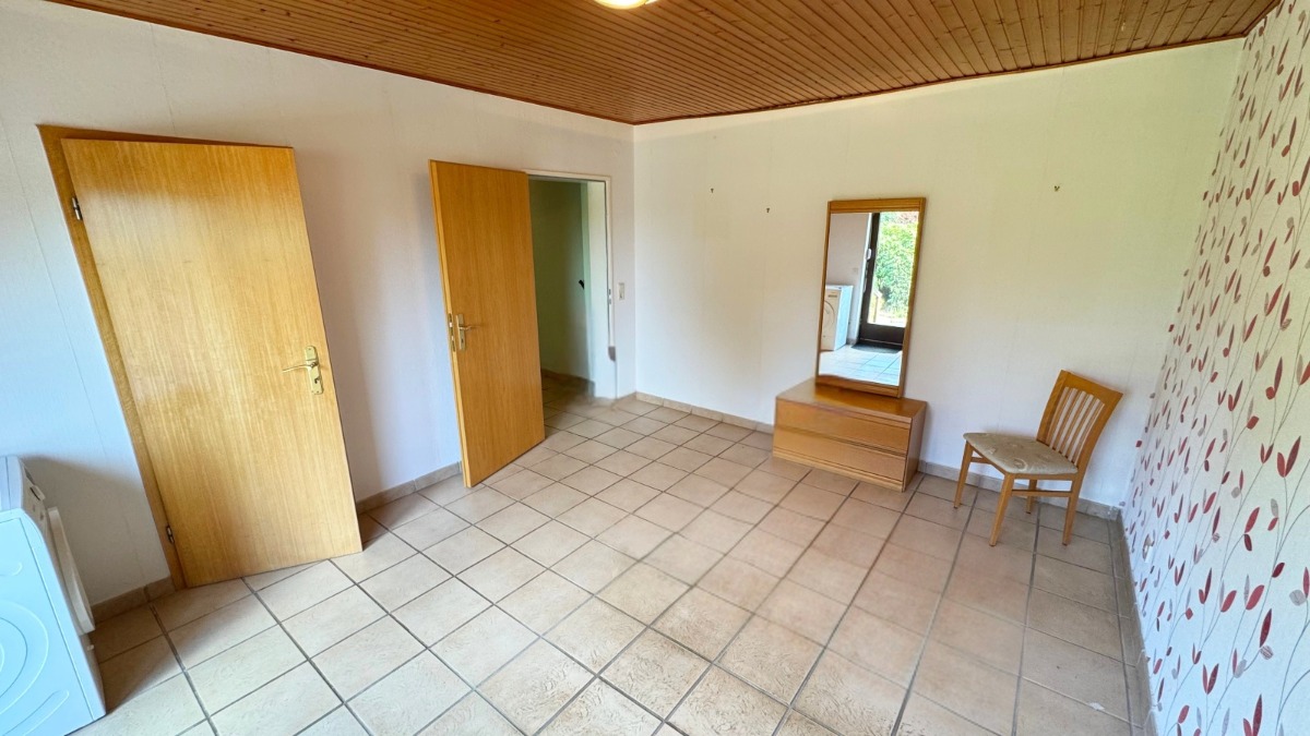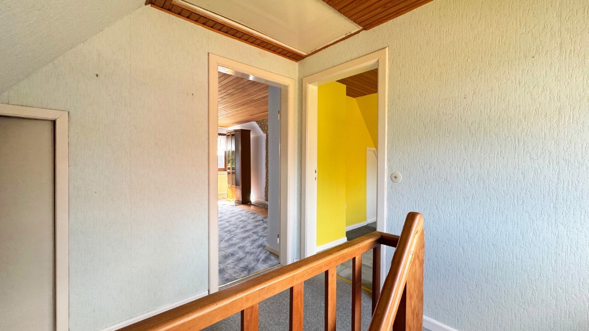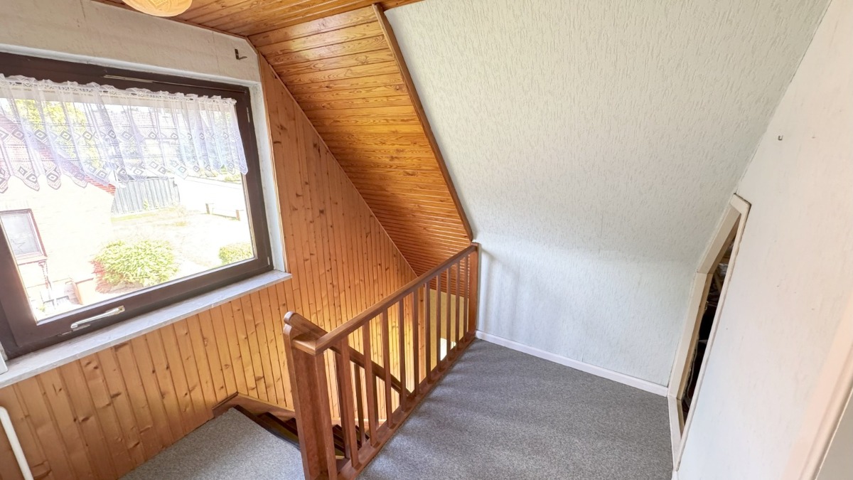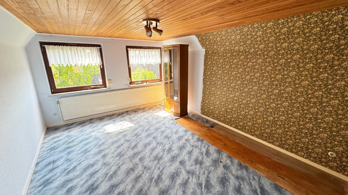 Das Obergeschoss bietet derzeit ein großes Schlafzimmer, welches ebenfalls geteilt werden könnte, und ein Durchgangszimmer mit Zugang zum ehemaligen Kinderzimmer oder mögliches Büro. Durch die beiden großen Abseiten wurde viel Stauraum geschaffen, und natürlich wäre auch noch der Spitzboden als Stellfläche verfügbar.