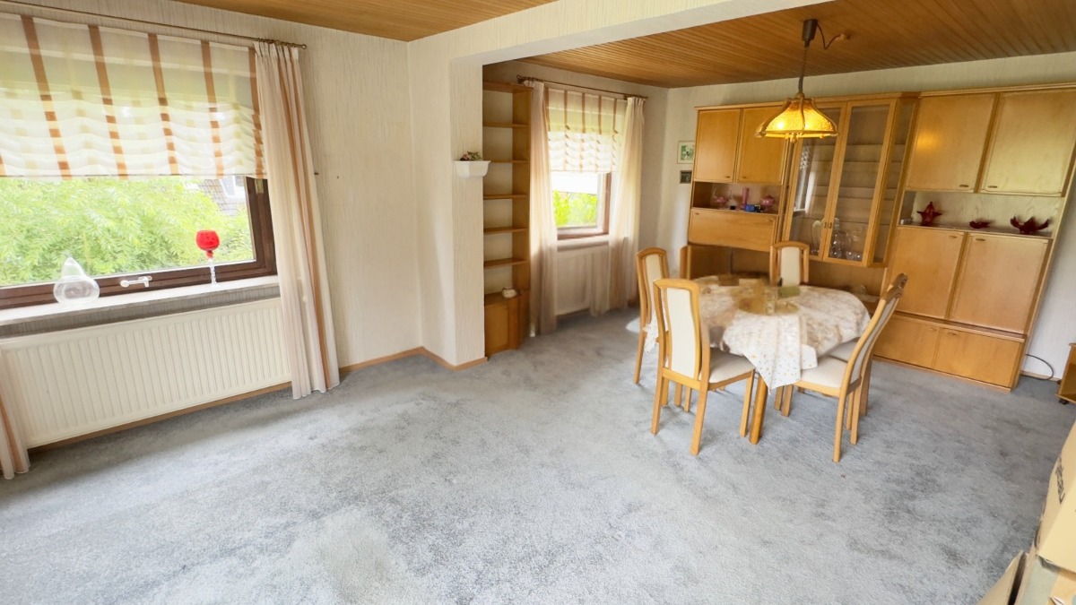 Diese Immobilie wurde in massiver Bauweise errichtet und steht in guter Infrastruktur nahezu im Grünen. Über die Zufahrt erreichst du zum einen die Garage und den Durchgang zum Garten, als auch den Eingangsbereich mit Garderobe. Vom Flur aus gelangt man zunächst in das großzügige und helle Wohn- und Esszimmer. Dieses Zimmer würde sich, wie es früher einmal war, auch in zwei Räume wieder teilen lassen. Groß genug ist es auf jeden Fall für gemütliche Abende mit der Familie. Ein Kamin könnte hier ebenfalls seinen Platz finden.