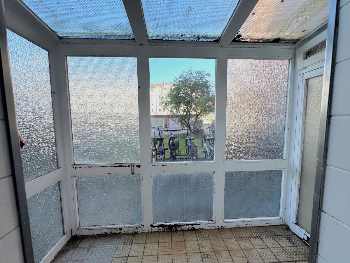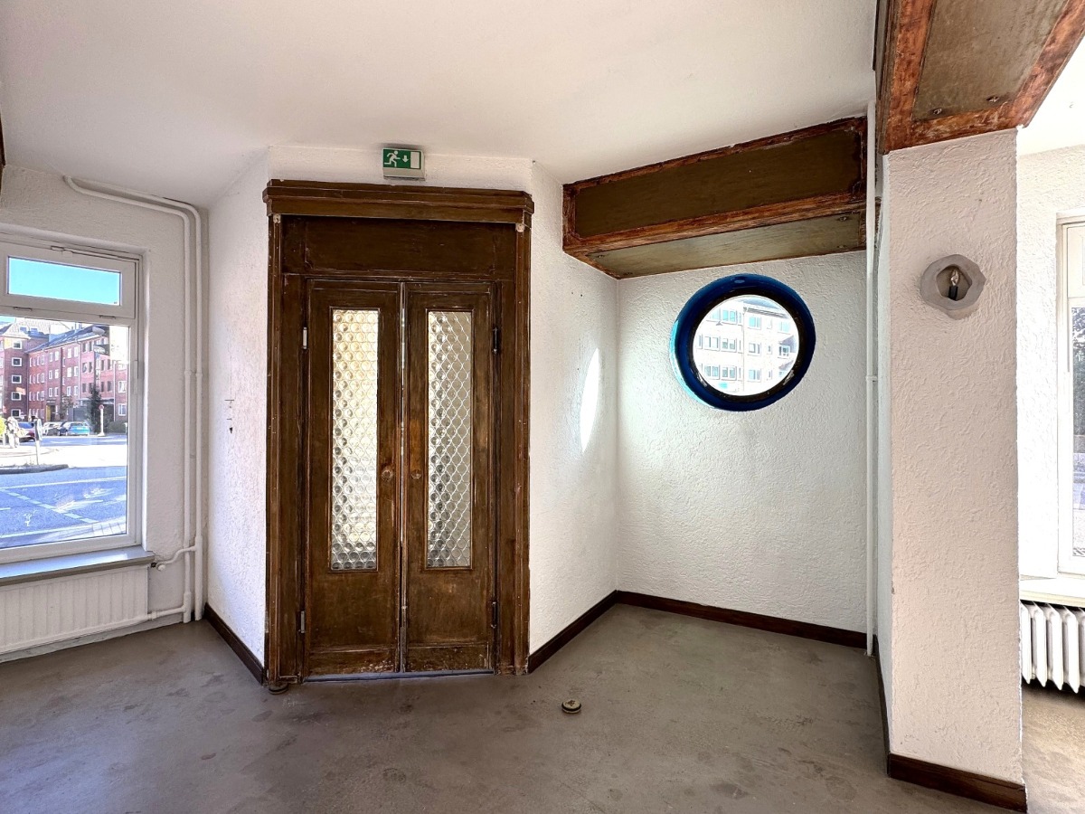 Im Erdgeschoss eines Eckgebäudes gelegen betrittst du den Eingang und gelangst durch eine Schwingtür in den einladenden Hauptbereich. Der Raum ist großzügig gehalten und besticht durch die großen Fenster mit Helligkeit. Links neben der Schwingtür befindet sich eine Nische mit einem Bullaugenfenster – perfekt für z.B. eine Garderobe.