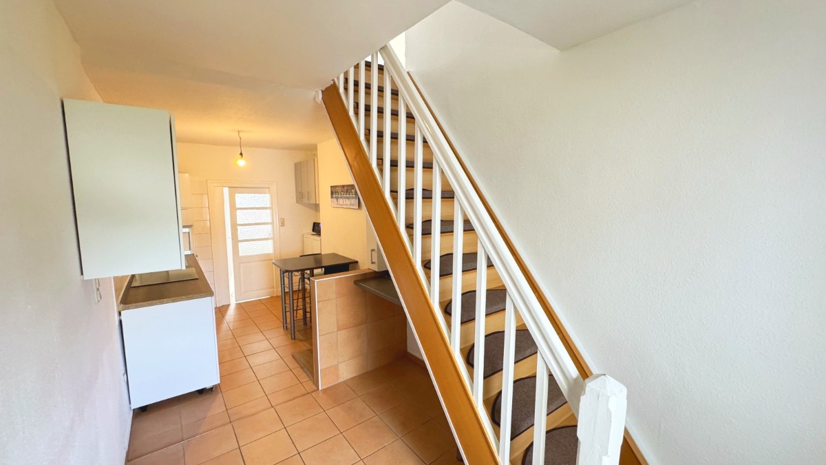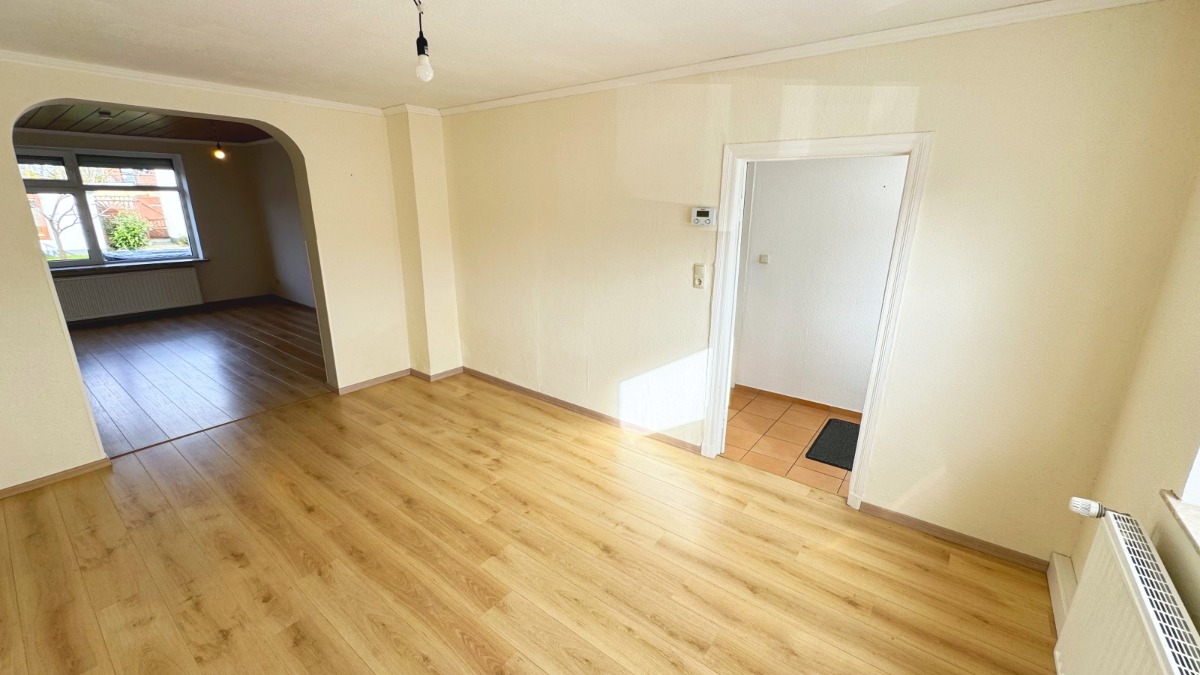 Über die sanierte und überdachte Haustür erreichen wir den Flur mit ausreichend Platz für die Garderobe und Zugang zum Wohn- und Esszimmer auf der einen Seite und zum Duschbad und Küche auf der anderen. Das Wohn-/Esszimmer besticht durch eine hervorragende Größe und Blick in den Garten. Ein Kaminanschluss ist hier möglich, perfekt für die kalte Jahreszeit. Ebenfalls zeitlos ist das Duschbad mit großer Dusche und Fenster. Modern ist dieses ebenfalls! Die Küche bietet ausreichend Platz für eine Essmöglichkeit und einen großen Kühlschrank. Von hier kann man auch in den Kellerraum herabsteigen. Etwas weiter befindet sich der Ausgang auf die Terrasse und die Treppe ins Obergeschoss.