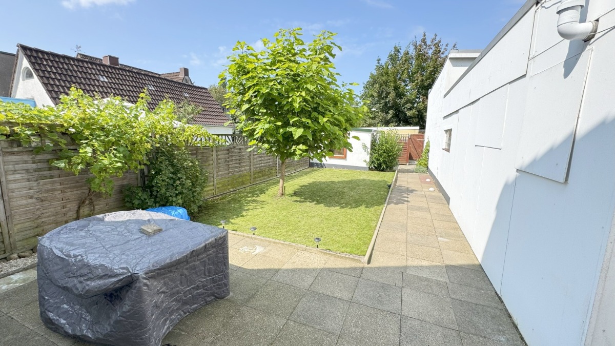 Hier können die Kinder spielen und dadurch, dass das Grundstück eingezäunt ist, könnte auch der Hund frei laufen. Alternativ kann man auch über ein kleines Tor von der Straße auf das Grundstück (um z.B. das Fahrrad sicher zu verstauen).