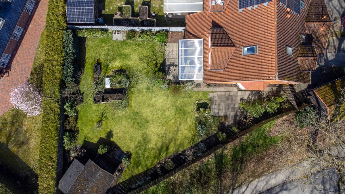 Als weiteres echtes Highlight ist der große Garten vorhanden. Hier kann nach Belieben gepflanzt und angelegt werden. Klettergerüst und Grillecke, Pool und Sandkiste für die Kinder, … Die Eltern können geschützt auf der überdachten Terrasse sitzen oder im Gartenhaus. Dieses bietet, ebenso wie der Abstellraum im Carport und neben der Terrasse, Staufläche für die Gartenmöbel und Gartengeräte. Ansonsten ist der Garten pflegeleicht angelegt und hohe Hecken sorgen für deine Privatsphäre.