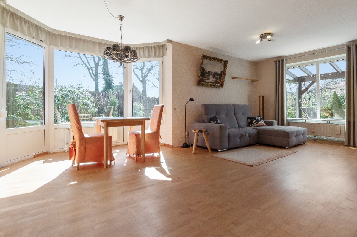 Als Highlight präsentiert sich das geräumige Wohn- und Esszimmer mit viel Lichteinfall und unzähligen Stellmöglichkeiten für die Couch sowie einem großen Esstisch. Besonders durch den Erker bietet sich ein besonderer Blick in den Garten, perfekt z.B. bei einem ausgiebigen Frühstück. Der Austritt auf die überdachte Terrasse ist von hier möglich, sowie der Treppenaufgang in das Obergeschoss.