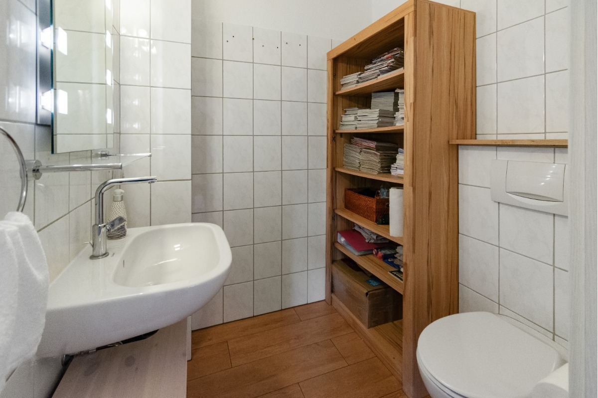 Für den Besuch ist gegenüber das Gäste-WC gelegen, laut der ursprünglichen Planung sogar mit Dusche, Platz genug ist vorhanden.