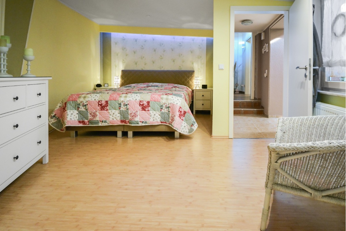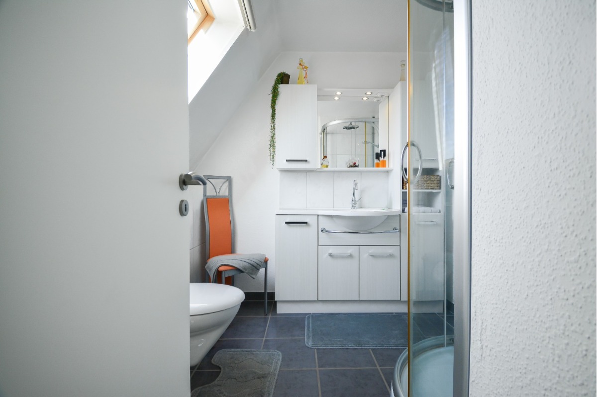 Die Treppe nach oben führt dich in ein Durchgangszimmer, was du als Ankleide oder Büro nutzen kannst und in ein Schlaf-, Kinder- oder Arbeitszimmer mit einem hellen Duschbad. Der Spitzboden eignet sich für Stauraum. Der Teilkeller birgt die Fernwärmeanlage und hält Lagermöglichkeiten für z.B. Vorräte vor. Im weitläufigen Garten hast du viele Verwirklichungsmöglichkeiten. Direkt an der Terrasse wurde ein schöner Teich angelegt, der eine traumhafte Atmosphäre für lange Sommerabende schafft. Der Garten ist sehr liebevoll, verwinkelt und detailreich angelegt. Es gibt mehrere Gartenhäuser und hinten auf dem Grundstück gibt es ein großes Gewächshaus.